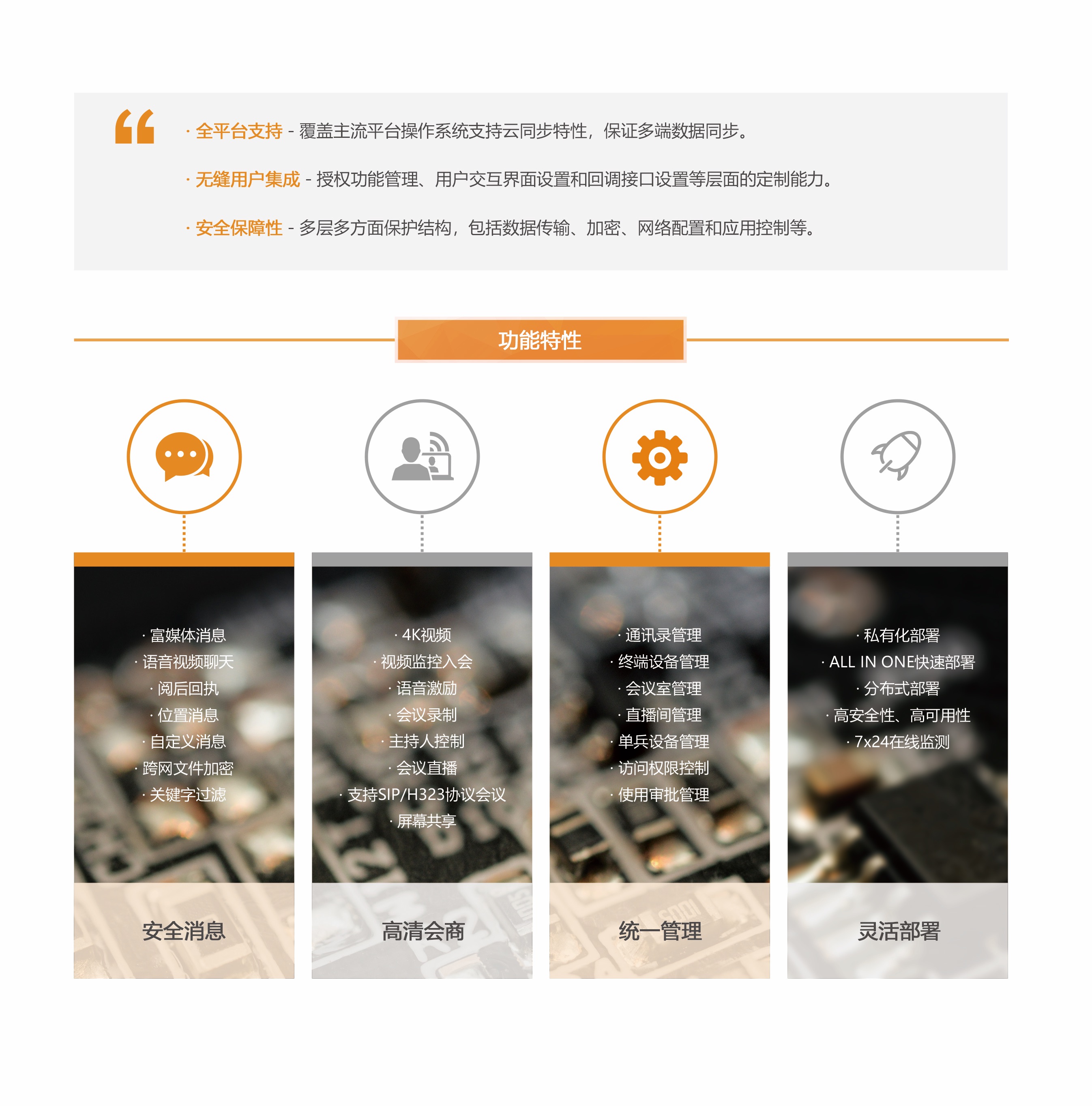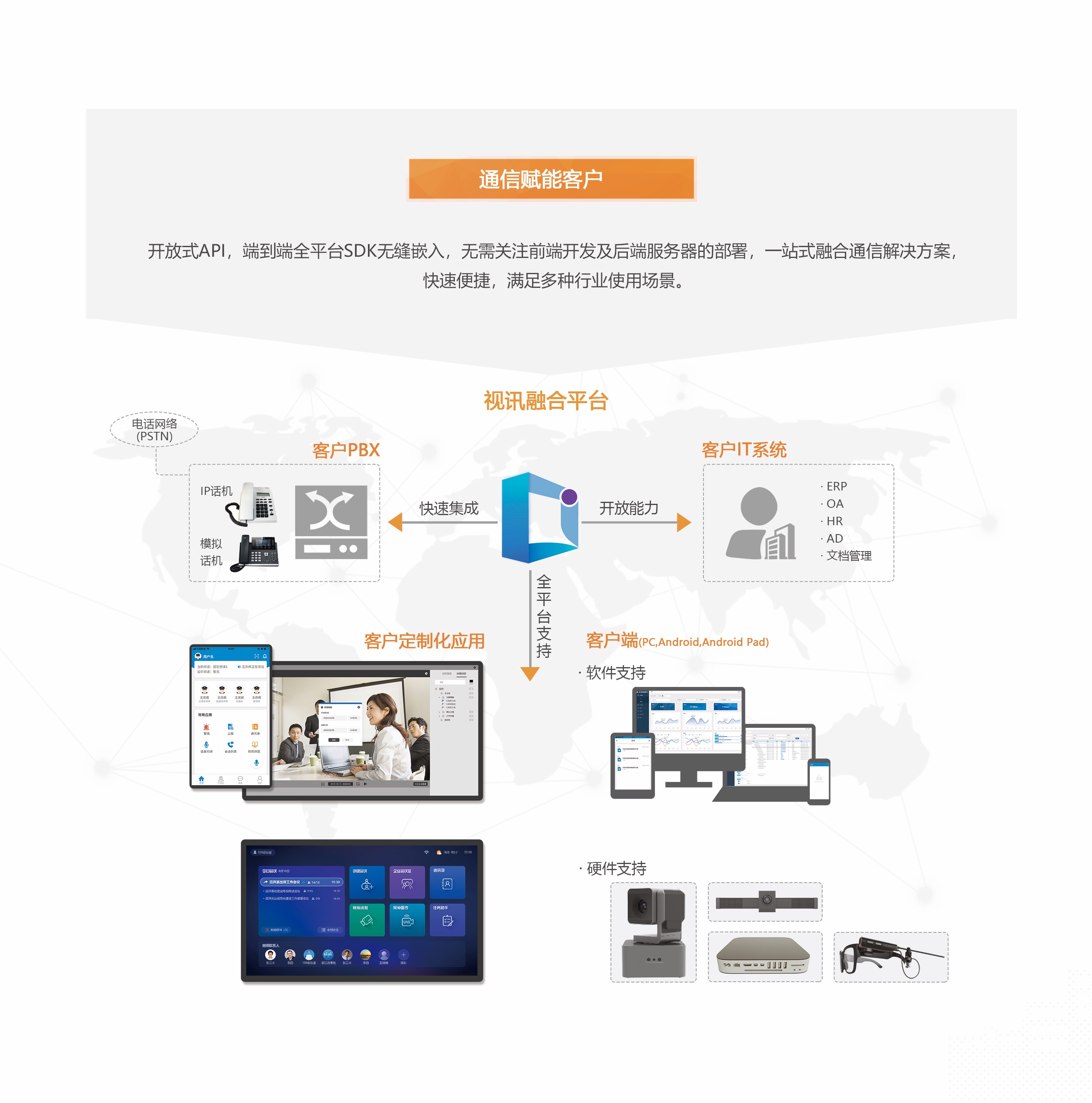 視訊融合平臺(tái)采用云架構(gòu)設(shè)計(jì)理念,使用多種核心技術(shù)優(yōu)化移動(dòng)網(wǎng)絡(luò)下音視頻傳輸,保障用戶在波動(dòng)的網(wǎng)絡(luò)環(huán)境下也能達(dá)到最佳的音視頻交互體驗(yàn)。平臺(tái)支持視頻會(huì)議、即時(shí)消息、監(jiān)控調(diào)度、視頻圖傳、可視化地圖等多種功能,提升了用戶協(xié)作;支持桌面終端、移動(dòng)終端、智能視訊終端等多種類型終端接入,保障用戶任意時(shí)間、任意地點(diǎn)、任意方式,都可以享受到高品質(zhì)的通信服務(wù)。 平臺(tái)具備超大容量、多形態(tài)部署、多種通信模式、靈活權(quán)限控制、統(tǒng)一通訊錄集成等特性,同時(shí)還通過開放式接口,提供強(qiáng)大的用戶定制功能,滿足多種行業(yè)使用場(chǎng)景。