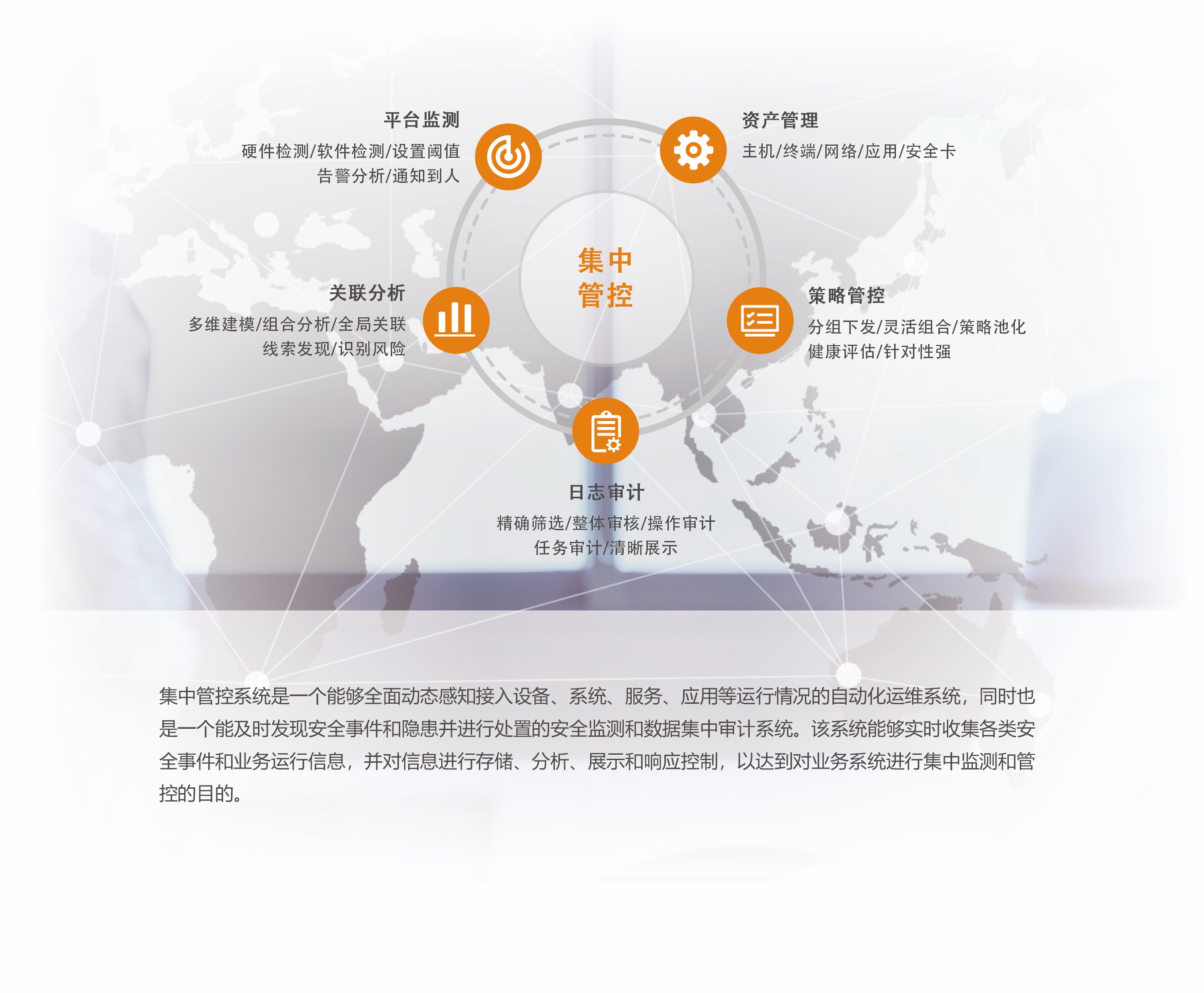 集中管控系統是一個能夠全面動態感知接入設備、系統、服務、應用等運行情況的自動化運維系統,同時也是一個能及時發現安全事件和隱患并進行處置的安全監測和數據集中審計系統。該系統能夠實時收集各類安全事件和業務運行信息,并對信息進行存儲、分析、展示和響應控制,以達到對業務系統進行集中監測和管控的目的。
